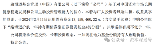 2024年3月12日,路博迈基金公告,基于对中国资本市场长期健康稳定发展和公司主动投资管理能力的信心,本着与广大投资者风险共担、收益共享的原则,于2024年3月11日运用固有资金申购公司旗下“路博迈护航一年持有期债券型证券投资基金A类份额”,并承诺持有期不低于一年。