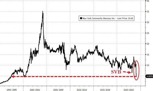 美国纽约社区银行(NYCB)在五天的时间里第四次出现两位数大跌。周二,NYCB股价暴跌22.2%,报4.20美元,创1997年以来收盘新低。