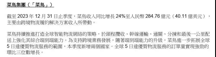 根据阿里巴巴最新财报数据显示,2024财年第三季度(2023年10月1日至12月31日),菜鸟营收同比增长24%达到284.76亿元,主要由跨境物流履约解决方案收入所带动;同期受益于规模经济效益以及在干线、最后一公里配送等环节的精细化运营带来的成本优化,菜鸟经调整EBITA(一项非公认会计准则财务指标)为9.61亿元,盈利能力继续增强。