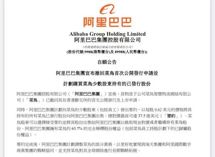 阿里巴巴3月26日公告,为更好加强与阿里电商业务协同,以及继续支持菜鸟扩大全球物流网络投入,决定撤回菜鸟上市申请,并要约收购菜鸟少数股东的股权和员工已归属的股权。本次收购涉及金额达到37.5亿美元。