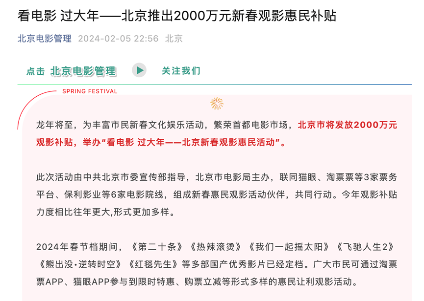这并非北京市首次发放观影补贴。2023年1月,北京市推出“新春观影惠民活动”,发放1000万元观影补贴。相比之下,2024年观影补贴力度比往年更大,且形式更加多样。