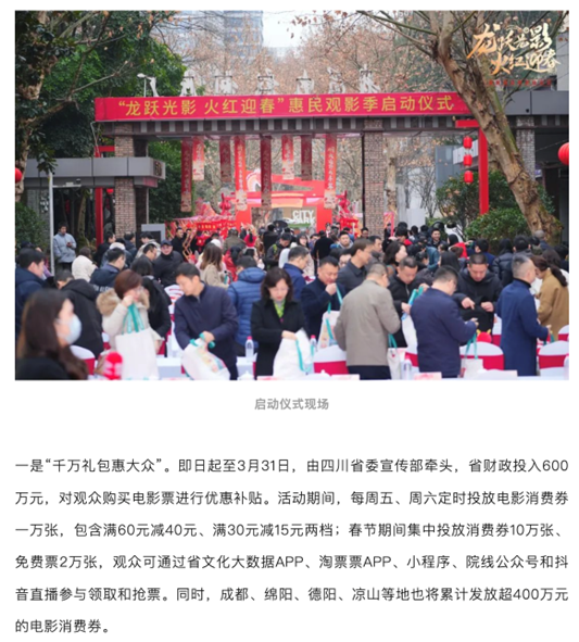 四川惠民活动期间将推出3项“电影大礼包”。第一个大礼包是“千万礼包惠大众”,从当日起至3月31日,由四川省委宣传部牵头,省财政投入600万元,对观众购买电影票进行优惠补贴。