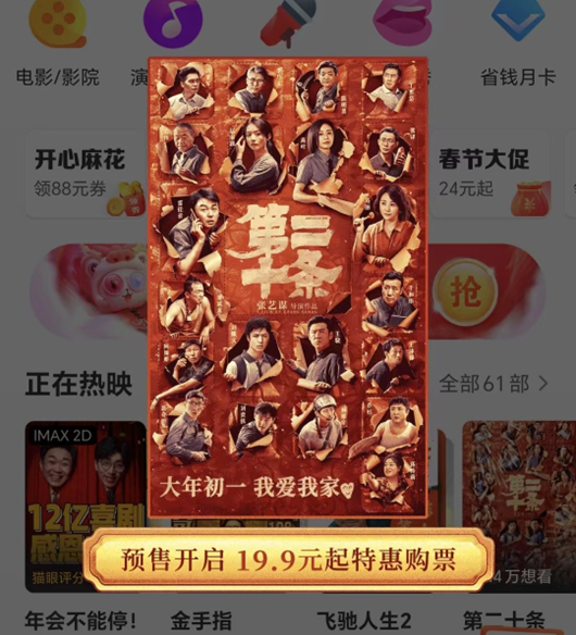 与此同时,今年春节档排片竞争激烈,多部春节档影片已推出优惠票价吸引观众。部分购票平台上,春节档影片出现19.9元低价,《飞驰人生2》甚至推出“买一赠一”活动。