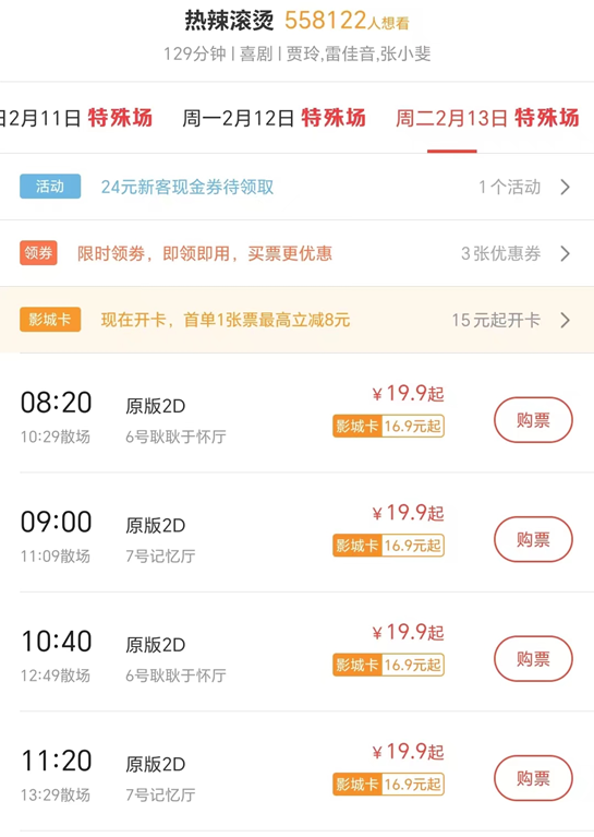 更大范围的是购票立减活动,该活动在春节期间的所有时间段,覆盖北京市所有影院、所有影片,有机会参与全日立减10元活动。